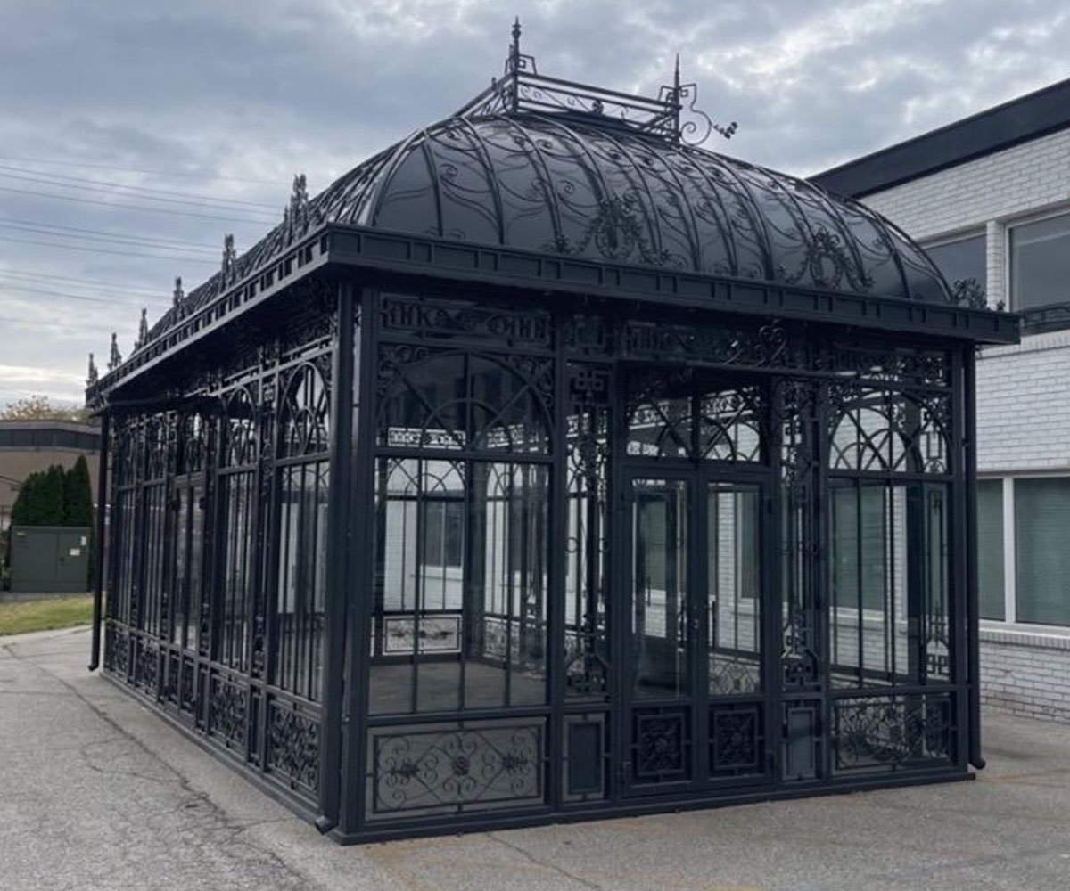 This black Victorian greenhouse’s exquisite wrought iron details and the elegant domed silhouette, add a touch of noble elegance to any landscape.